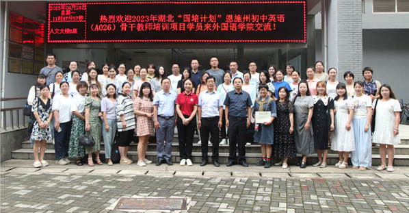 外国语学院领导对“国培计划”恩施州初中英语培训项目全体学员的到来表示热烈欢迎,并带领老师们参观外国语学院历史发展文化墙。
