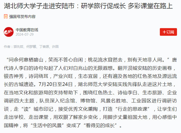 今年暑期,湖北师范大学200余支团队、数千余名青年师生走进乡土中国深处,足迹遍布全国22个省(市/自治区),深入开展各类主题社会实践活动,在社会实践的广阔舞台上“受教育、长才干、做贡献”,让青春在“自找苦吃”中拔节成长。