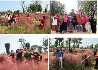 随后,大家又来到大冶金湖生态园,漫步在金黄的树木丛中,感受秋日大自然的气息。走到园区粉黛乱子草区域,大片大片的粉色草丛随风吹动,宛如波浪起伏的粉色云海,美丽的景象吸引了不少老同志合影留念。粉黛乱子草的花语是美好的等待,寓意着对未来的祝福,也正寄托了老同志们对未来美好生活的期待。在品尝了淳朴的农家风味饭菜后,老同志们愉快平安地返回学校。