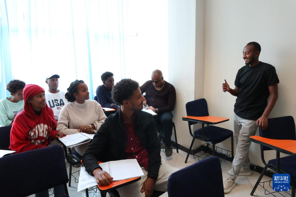 6月15日,在埃塞俄比亚首都亚的斯亚贝巴市中心的一家中文培训机构内,中文教师卡利布·泽拉莱姆(右一)在课堂上与学生们对话。
