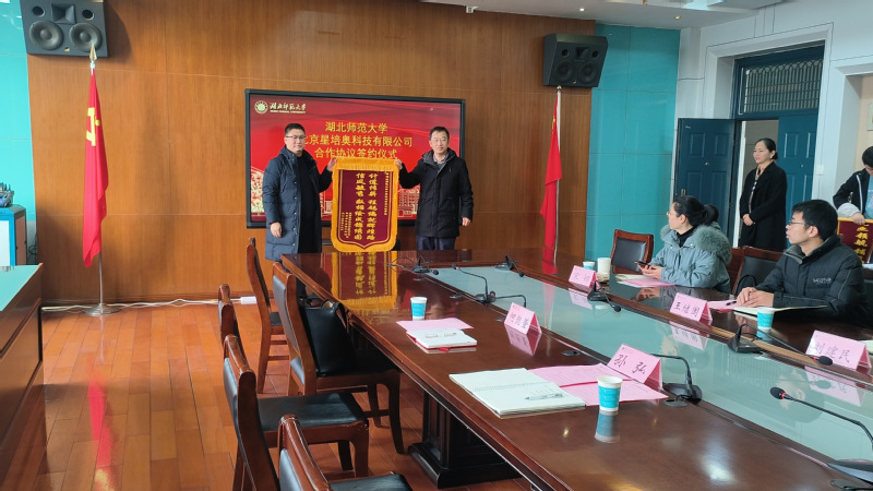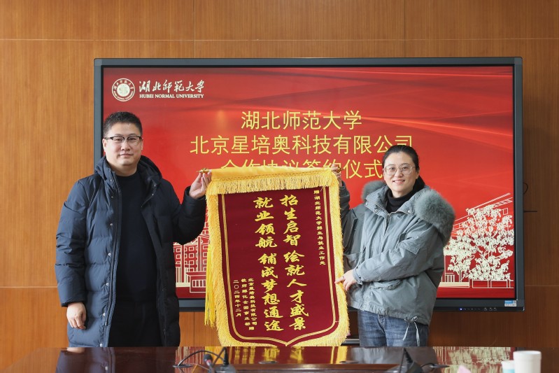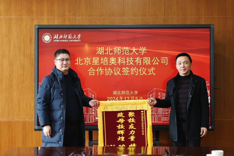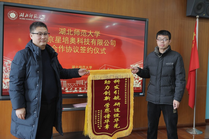在双方代表的见证下,365上市公司官网与北京星培奥科技有限公司签署了《产学研合作协议书》。签约仪式后,孙宏总经理代表北京星培奥科技有限公司向湖北师范大学科发院、招就处、校友工作处和计信学院等四家单位授旗。