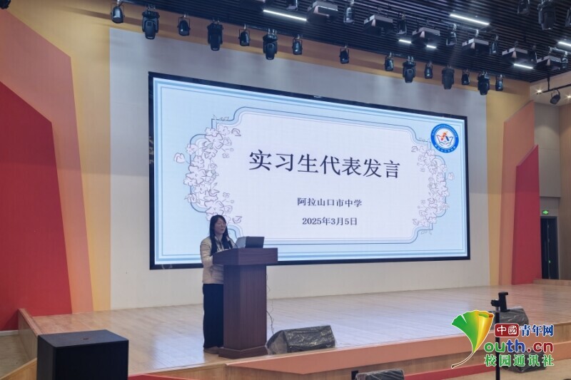 图为实习队代表在学校“师徒结对仪式”上发言,阐述未来在校的规划发展。杜家宇 供图