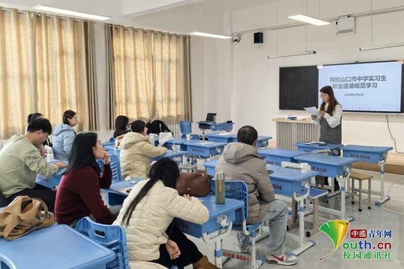 图为学校负责老师带领实习队成员们一起进行职业道德规范学习。杜家宇 供图
