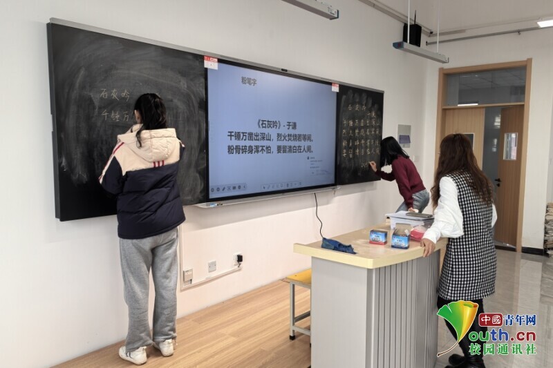 图为指导老师组织实习队成员们开展粉笔字板书专业训练。杜家宇 供图