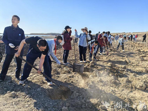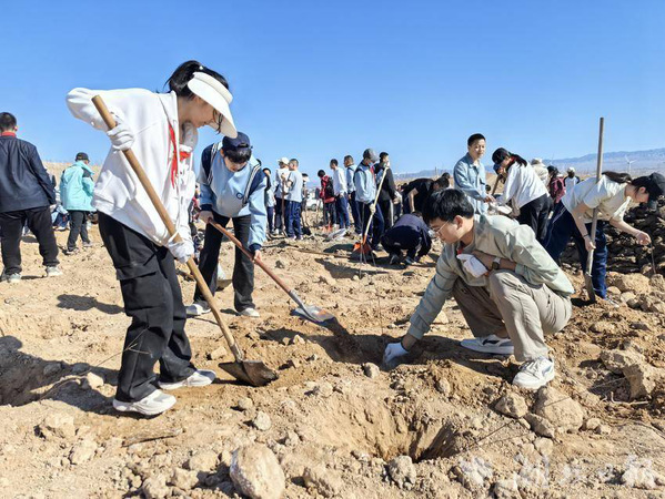 湖北日报客户端讯(通讯员杜家宇)4月11日上午,湖北师范大学“研究生教育援疆实习队”在新疆博尔塔拉蒙古自治州湖北师范大学附属阿拉山口市中学的组织下,带领学校八年级学生在阿拉山口市“8字湖”旁的戈壁滩开展了一场以“援疆教育扎根边疆,绿色行动再添新篇”为主题的植树活动。此次活动不仅是援疆教育工作的延伸,更是湖北师范大学践行生态文明理念、深化鄂疆协作的生动实践。