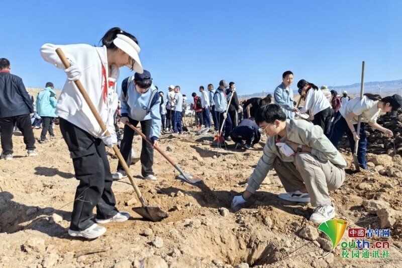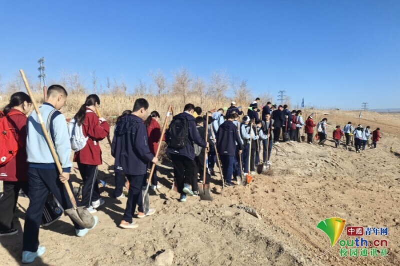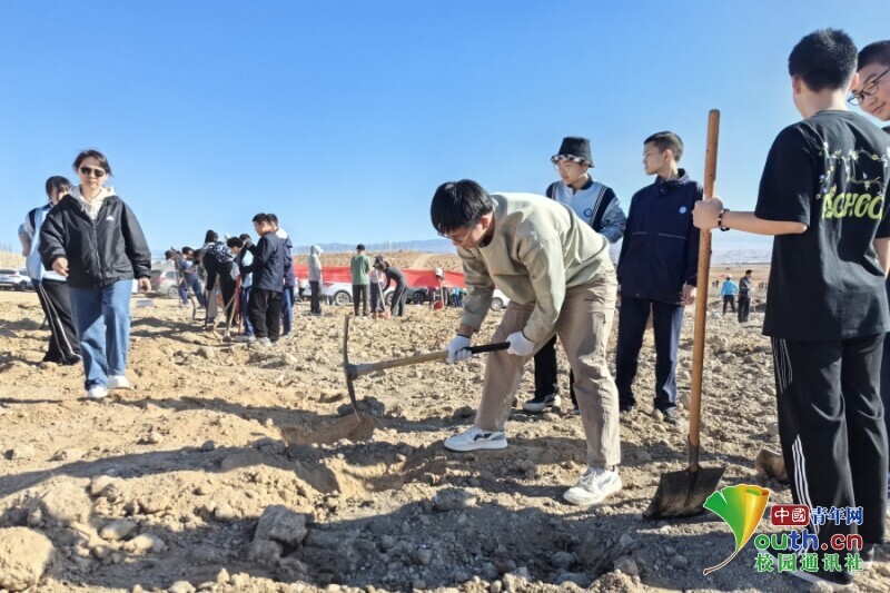 图为实习队员们协助学校老师们一起,带领八年级的学生们到阿拉山口市“8字湖”旁的一处戈壁滩开展植树活动。杜家宇 供图
