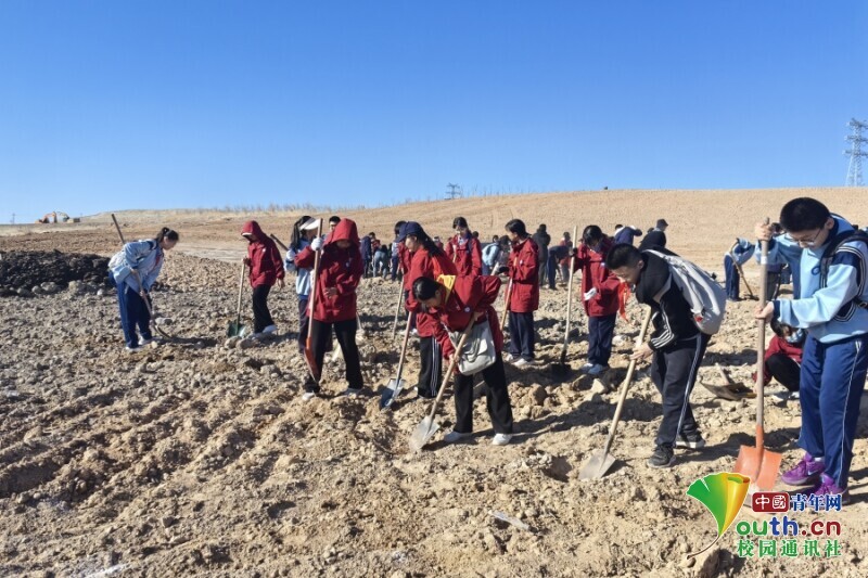 图为湖北师范大学附属阿拉山口市中学八年级的学生们开始进行树洞的挖掘。杜家宇 供图