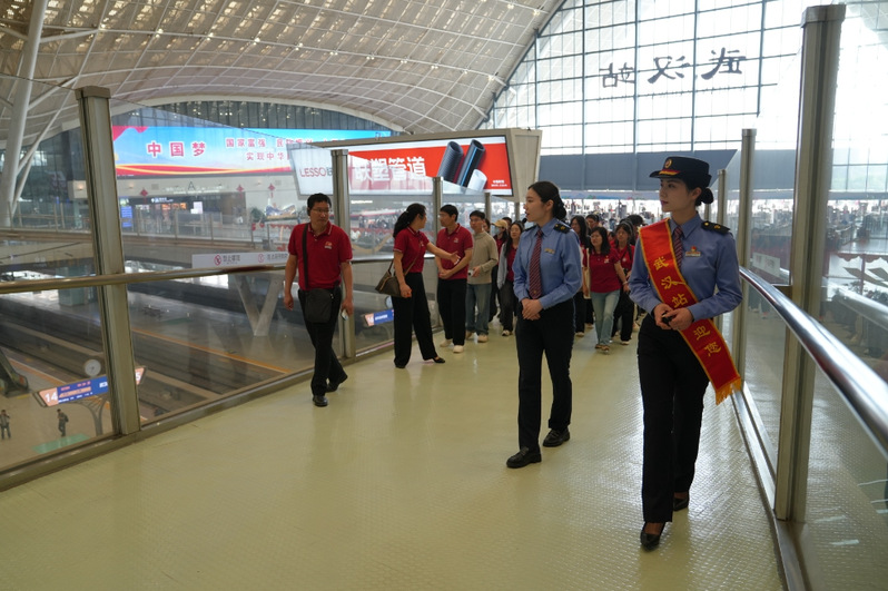 4月25日,湖北师范大学马克思主义学院的70余名师生走进中国铁路武汉局集团有限公司(以下简称“武铁”),开启了一场别开生面的思政研学之旅。师生们从黄石北站出发,搭乘高铁前往武汉站、武汉二七纪念馆以及武汉高铁职业技能训练段,实地感受现代化高铁站的魅力,追溯铁路红色历史,探寻铁路发展脉络,沉浸式体验高铁前沿科技,深切领略中国高铁的速度与便捷。