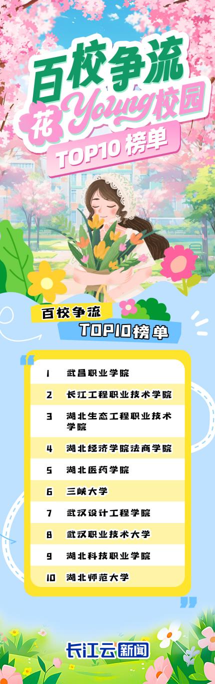 荆楚大地“百校争流”,一校一景“花Young校园”。由湖北省教育厅宣传中心、湖北广播电视台新闻中心联合湖北高校新媒体联盟发起的“百校争流 花Young校园”展示活动,近日圆满收官。广大网友积极参与互动,“花Young校园”点赞量Top10榜单火热出炉!