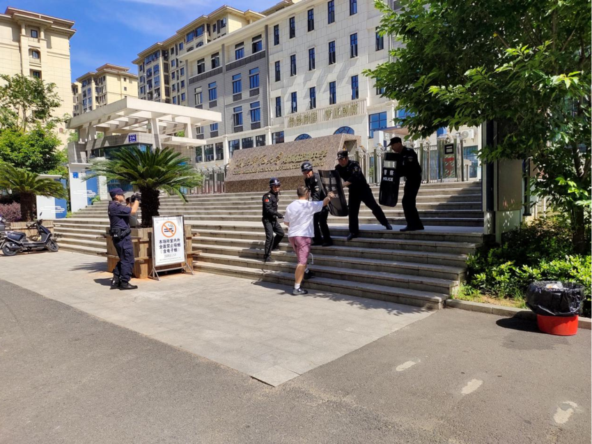 当日上午10时,演练正式开始。模拟场景设定为“可疑人员持械试图闯入校园”,学校安保人员立即启动应急预案,拉响警报并封锁校门。社区民警迅速抵达现场,与前期培训过的教职工“应急处置小组”成员默契配合,持防暴器械形成包围态势,通过喊话警告、战术压制等方式,合力控制“可疑人员”。