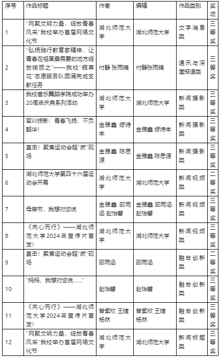 湖北高校新闻奖是湖北省高校优秀新闻作品最高奖,由湖北省高校新闻协会主办。2024年度湖北高校新闻奖设消息类、通讯与深度报道类、言论类、新闻摄影类、版面类、媒体融合类,全省高校千余件作品参加评选。在湖北师范大学党委宣传部的指导与支持下,学校学生通讯社(简称“学通社”)充分展现出了学校学生宣传队伍的专业风采,共斩获12项奖项,其中二等奖2项、三等奖10项,获奖数量实现了新的突破。现将获奖名单公布如下:
