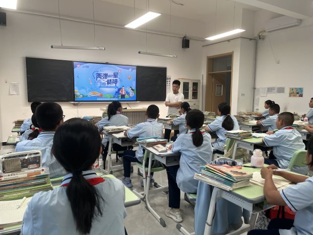 为传承红色基因、弘扬爱国主义精神,6月29日下午,湖北师范大学研究生教育援疆实习队队长、“逐光”宣讲团成员杜家宇在新疆博尔塔拉蒙古自治州湖北师范大学附属阿拉山口市中学,为初中部七年级学生带来了一场别开生面的“两弹一星”精神主题宣讲活动。