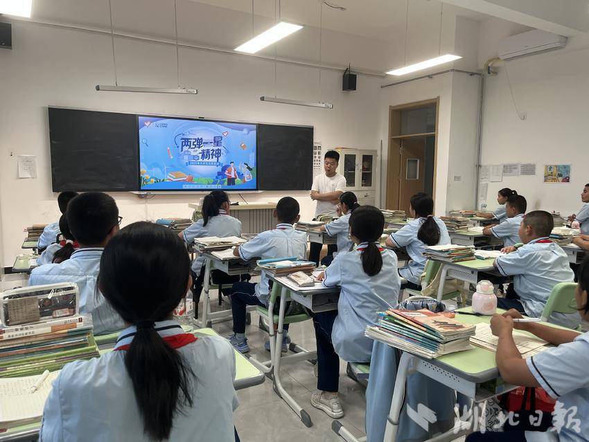 湖北日报客户端讯(通讯员杜家宇)为传承红色基因、激发爱国热情、引导学生们树立远大理想,6月29日下午,湖北师范大学研究生教育援疆实习队队长、“逐光”宣讲团成员杜家宇在新疆博尔塔拉蒙古自治州湖北师范大学附属阿拉山口市中学,为初中部七年级的学生们开展了一场以“两弹一星”精神为主题的志愿宣讲活动。