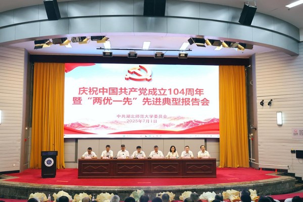为热烈庆祝中国共产党成立104周年,弘扬先进典型精神,激励学校各级党组织和广大党员牢记初心使命,持续拼搏、砥砺奋进,全力开创湖北师范大学高质量发展的新局面。7月1日下午,湖北师范大学在教育大楼学术报告厅隆重举行庆祝中国共产党成立104周年暨“两优一先”先进典型报告会。全体校领导、全校副处级及以上党员干部、“光荣在党50年”老党员代表、受表彰的“两优一先”代表、全体党支部书记以及师生党员代表出席大会。大会由校党委副书记、校长雷儒金主持。