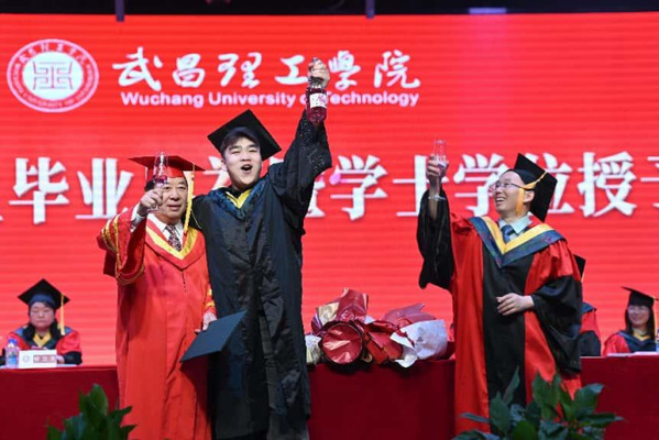 在校园操场的看台上,武汉传媒学院播音主持艺术学院毕业生坐在一起。巨型数字气球、鲜花、扬起的学士帽和灿烂的笑,把毕业的喜悦与不舍,都融进这承载青春的场景,是对校园时光的告别,也是奔赴新程的激昂序章。