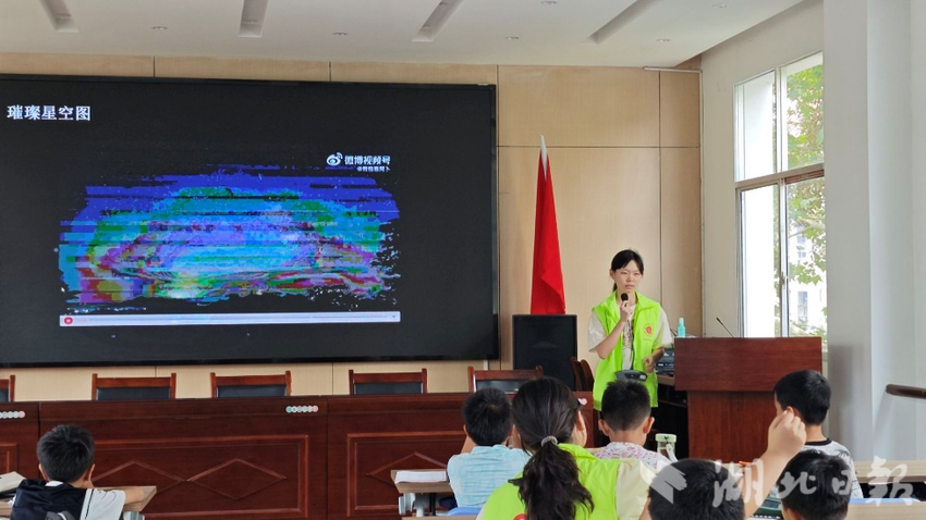 在星空科普课堂上,志愿者周晓曼以生动比喻开启知识讲解:“恒星如‘宇宙火球’会发光,行星则靠恒星照亮。”瞬间点燃小朋友们的好奇心。当北斗七星图片呈现时,孩子们齐呼“好像勺子”,眼中满是惊喜。志愿者借势讲解天文望远镜原理,鼓励孩子们永葆探索热忱,做仰望星空的追梦人。