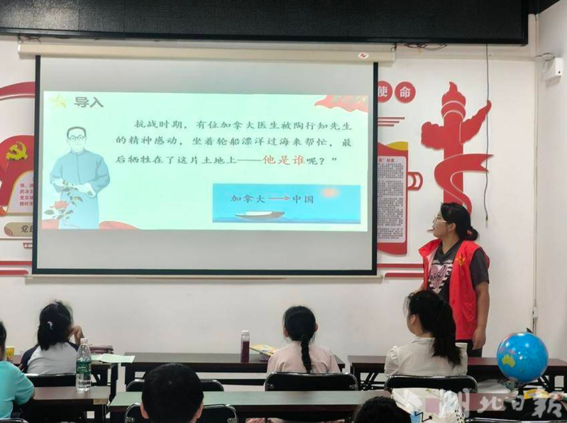 互动环节中,范璐结合白求恩事迹提出问题,孩子们纷纷举手回应。当问到“白求恩爷爷做的事,让我们学到了什么”,孩子们稚嫩的声音此起彼伏:“要帮别人”“不能怕辛苦”“要有担当”。在志愿者的引导下,小朋友们逐步理解了白求恩“爷爷”跨越国界的医者仁心,感受到了战火中闪耀的人道主义光辉。