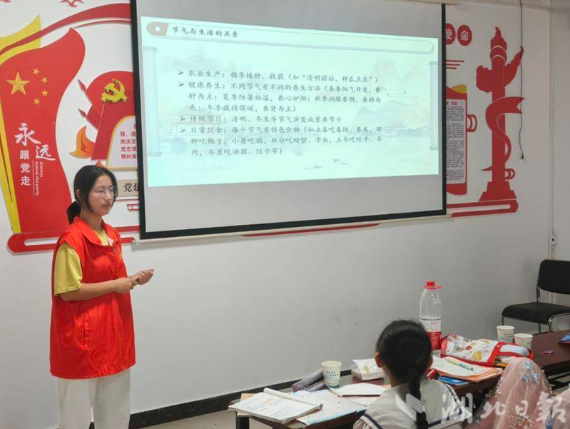 志愿者汪颖借“小暑”时节,开启“二十四节气”之旅。诵读《节气歌》、玩转“猜节气”,孩子们在“小暑吃藕解暑热,冬至饺子暖寒冬”的民谚中,感悟传统文化与生活的美妙联结。