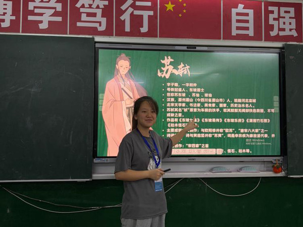 队员庞晨曦为九年级学生讲授苏轼生平。 李书涵 供图。