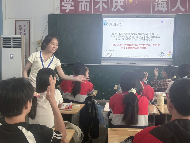 “祝同学们在成长的道路上,平平安安、顺顺利利,用安全为梦想保驾护航!”7月24日下午,排市初级中学八(2)班教室里,支教老师的深情话语盖过了窗外蝉鸣。这是湖北师范大学星火筑梦实践队在该校暑期爱心托管班开设的最后一节卫生健康课,也是本次“青春护航”学生自护教育系列课程的收官之作。自7月4日开班以来,实践队认真学习落实《关于加强12355青少年自护教育的工作指引》的相关要求,面向七至九年级共400余名学生,以“安全是底线、乐学是动力、成长是目标”为核心宗旨,围绕生命安全、心理健康、青春期教育三大板块,以《卫生健康》《心理健康》课程为教育主阵地,同时依托班会、升旗仪式、TV新闻时间开展“短平快式”施教。各班累计学时数超过30学时,把自护教育从“附加题”变成了“必答题”,通过“理论+实践”“互动+体验”的多元化教学模式,为孩子们构筑起一张“看得见、摸得着、用得上”的青春防护网。