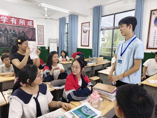 实践队成员吕兴鹏在和学生一起演示“特工密信”实验 余雨霏 供图