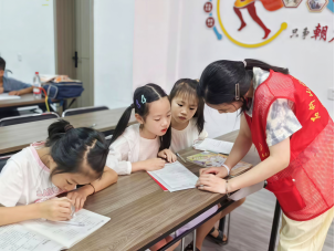 志愿者杨涵辅导小朋友作业 祝淼洋 供图